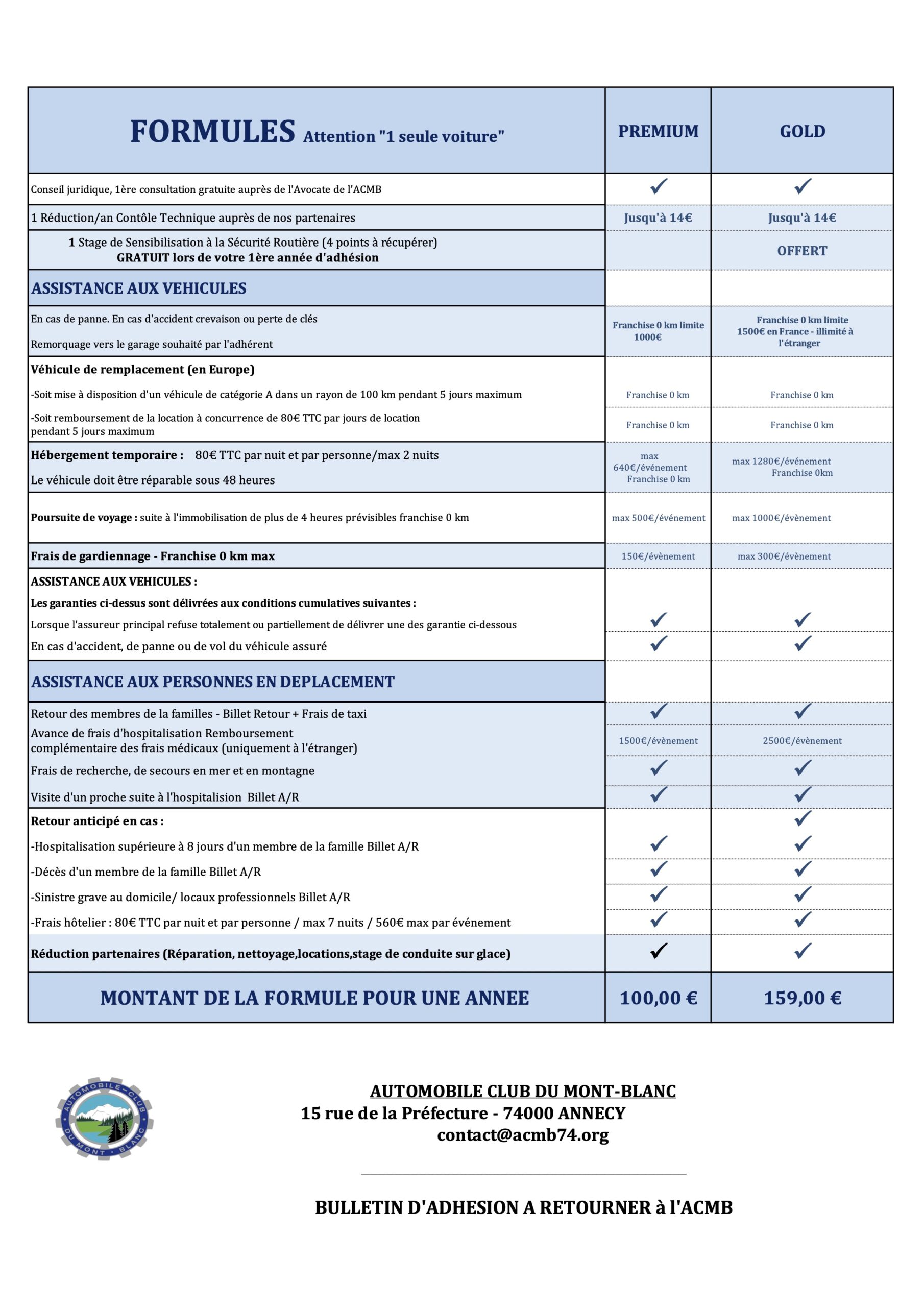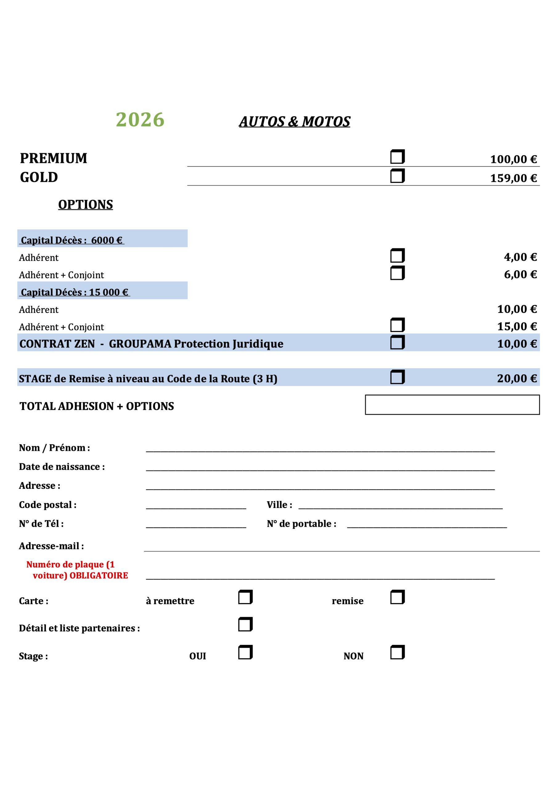 Adhésions ADHÉSION EN LIGNE Adhésion100.00€ – 159.00€Plage de prix : 100.00€ à 159.00€ Formule Choisir une optionPREMIUMGOLDEffacer OPTIONS Capital décès 6000 euros adhérent (4.00€) Capital décès 6000 euros adhérent + conjoint (6.00€) Capital décès 15000 euros adhérent (10.00€) Capital décès 15000 euros adhérent + conjoint (15.00€) CONTRAT ZEN – GROUPAMA Protection Juridique (10.00€) STAGE de Remise à niveau au Code de la Route (3 H) (20.00€) N° d'immatriculation de votre véhicule * Votre date de naissance * Votre n° de téléphone * Total produit Total des options Total général quantité de Adhésion Ajouter au panier UGS : ND Catégorie : Adhésion Description Description OU FORMULAIRE D’ADHÉSION PAPIER Télécharger le document