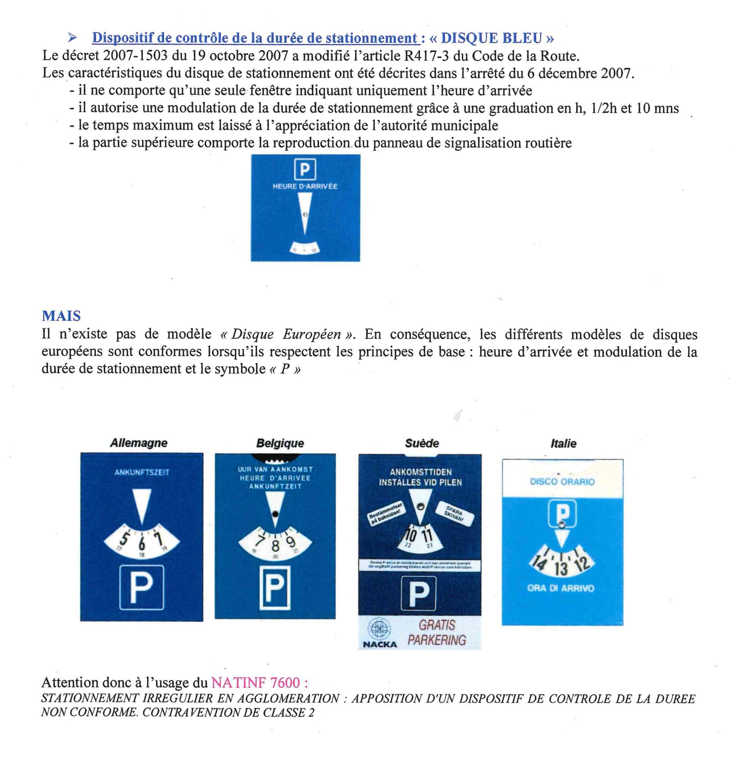 Dispositif de contrôle de la durée de stationnement: « DISQUE BLEU »